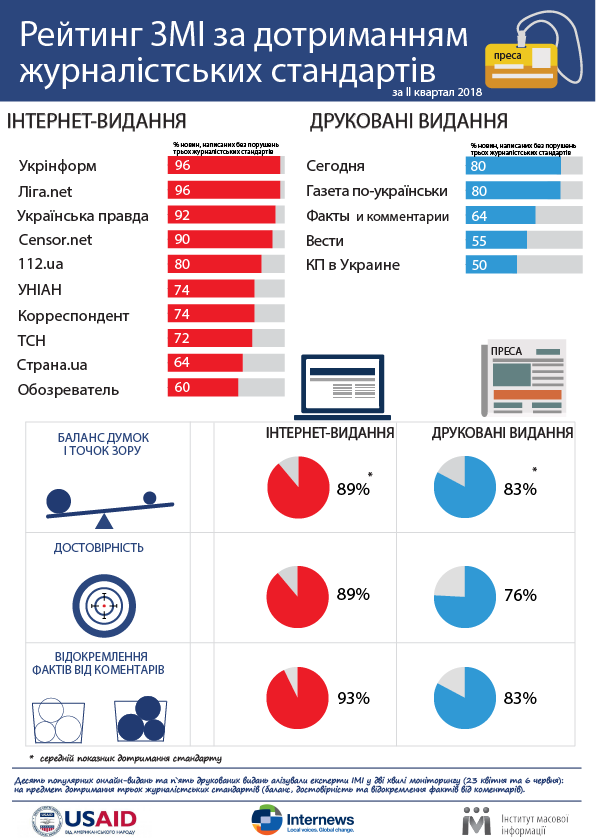 У другому кварталі 2018 року рейтинг дотримання журналістських стандартів в інтернет-ЗМІ очолили два сайти – Ліга.net та Укрінформ, у яких 96% матеріалів були написані без порушень журналістських стандартів.