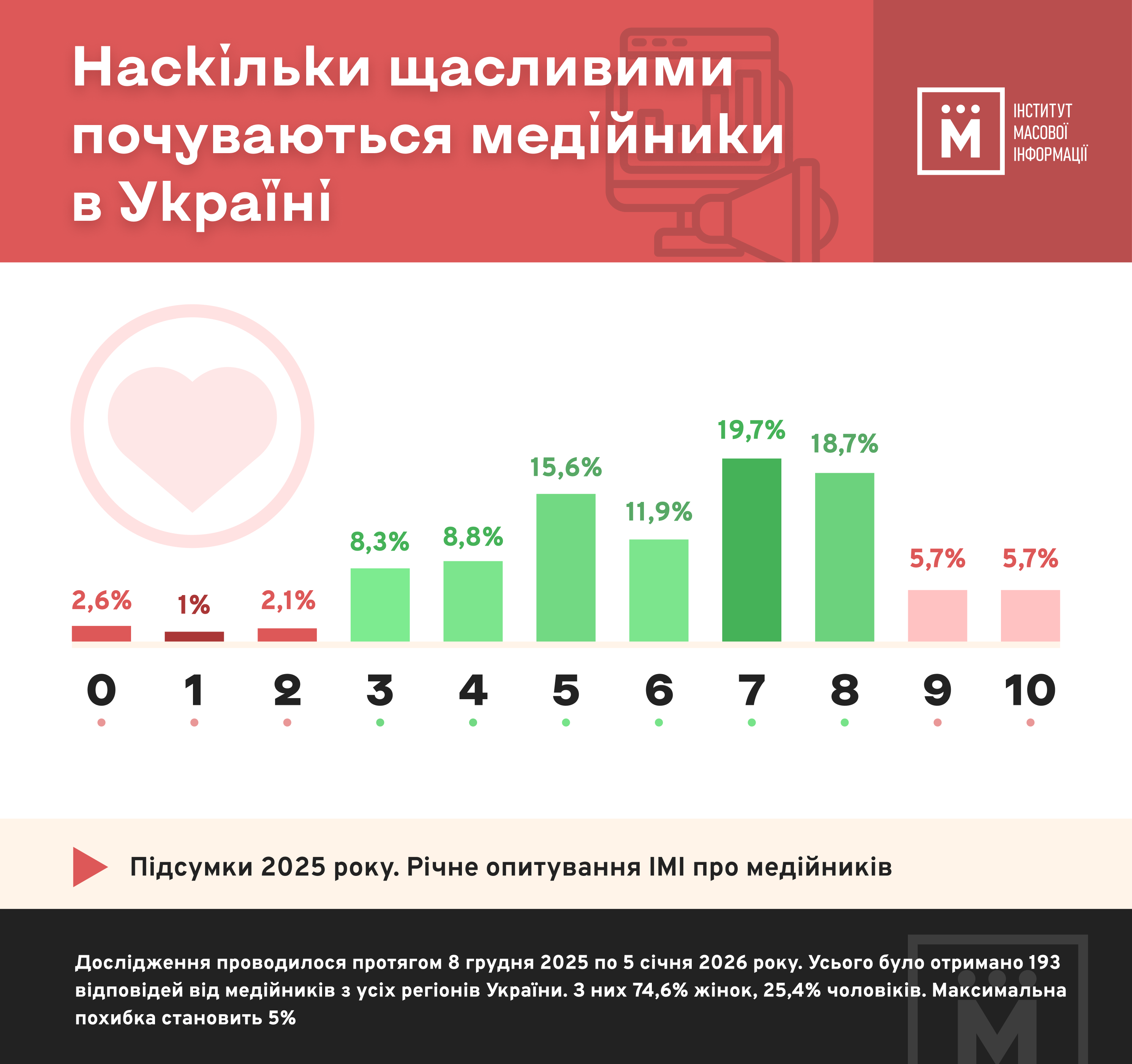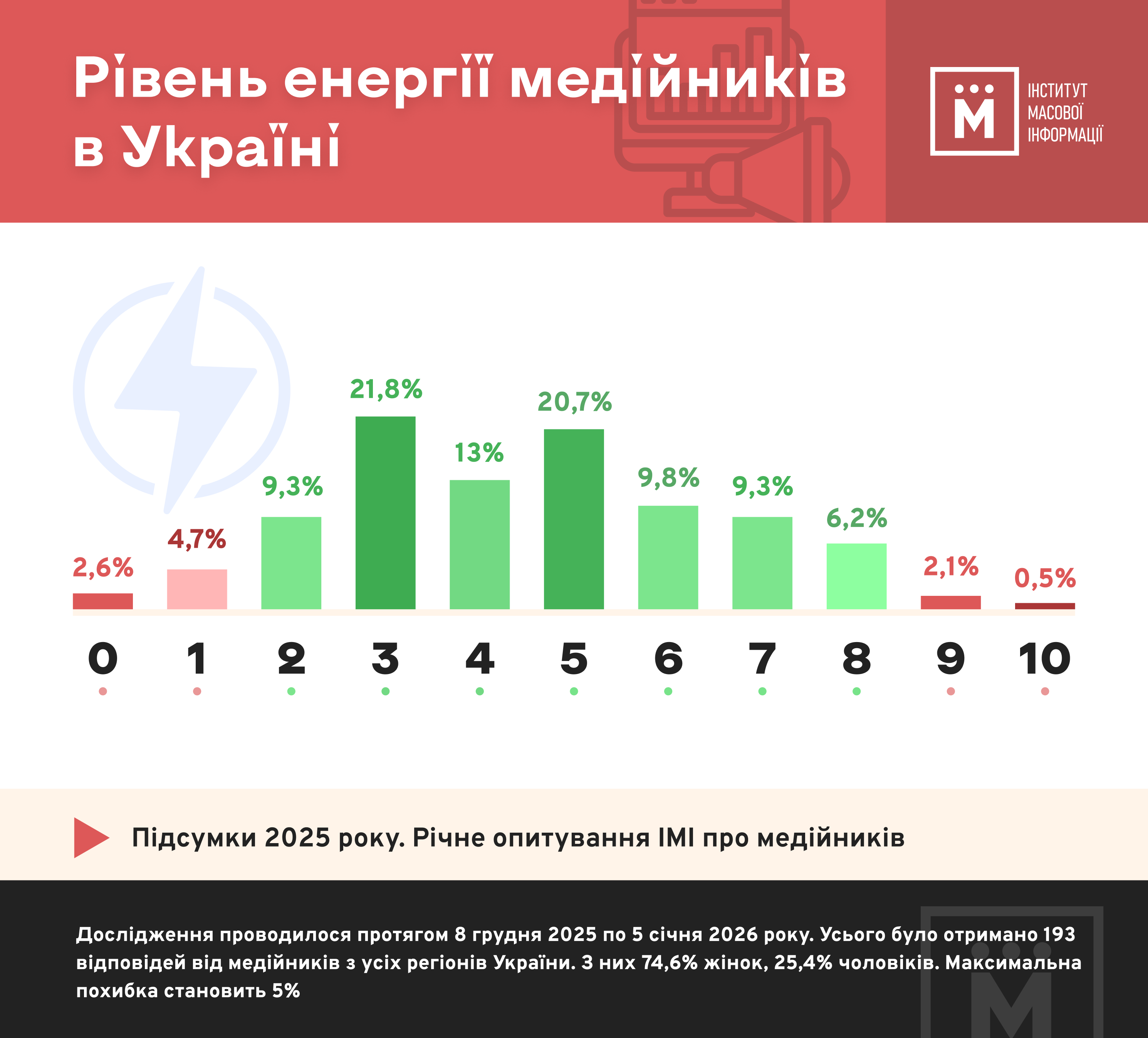 *Дослідження проводилося методом кількісного анонімного онлайн-опитування за простою випадковою вибіркою серед потенційних респондентів – журналістів і редакторів. Усього отримано 193 відповіді від медійників з усіх регіонів України. З них 74,6% жінок, 25,4% чоловіків. Максимальна похибка становить 5%. Дослідження проводилося протягом 8 грудня 2025 – 5 січня 2026 року.