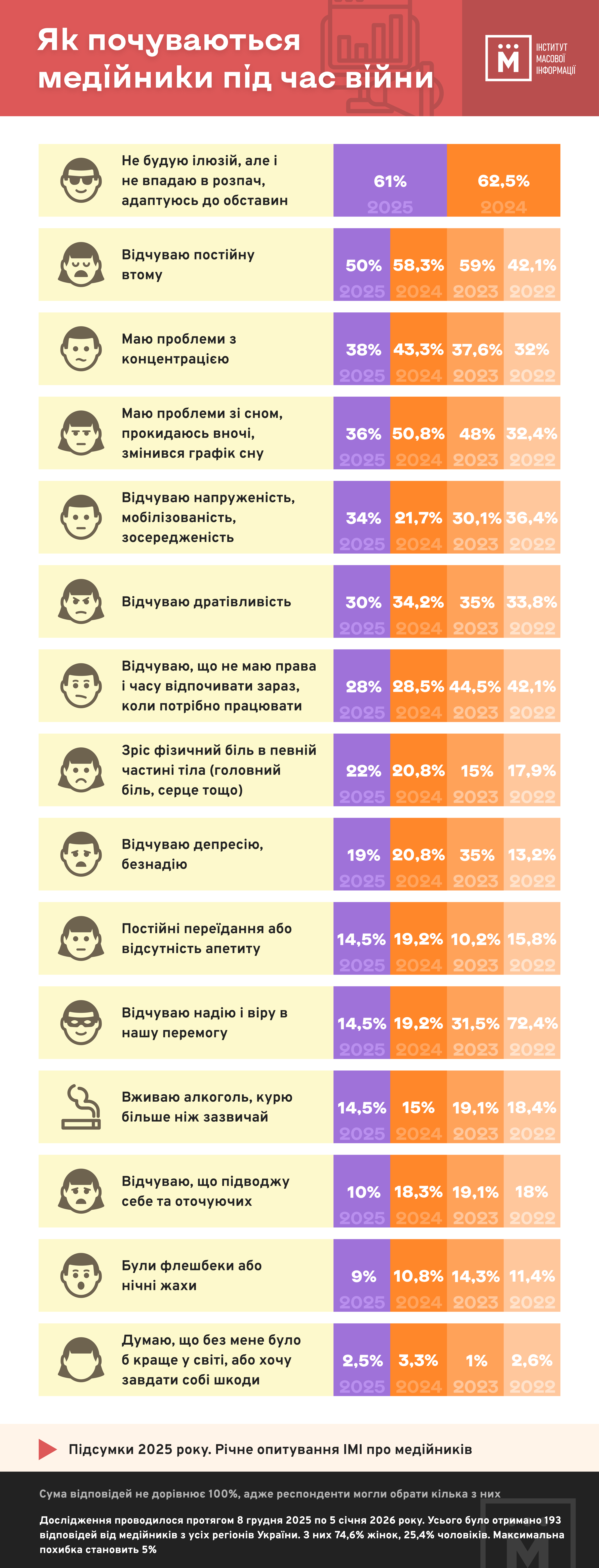 Разом із цим опитування ІМІ фіксує зменшення гострих симптомів стресу. Зокрема, частка журналістів із проблемами зі сном знизилася з 50,8% у 2024 році до 36% у 2025-му. Депресивні стани та відчуття безнадії скоротилися з 35% у 2023 році до 19% у 2025-му. Флешбеки та нічні жахи у 2025 році задекларували лише 9% опитаних.