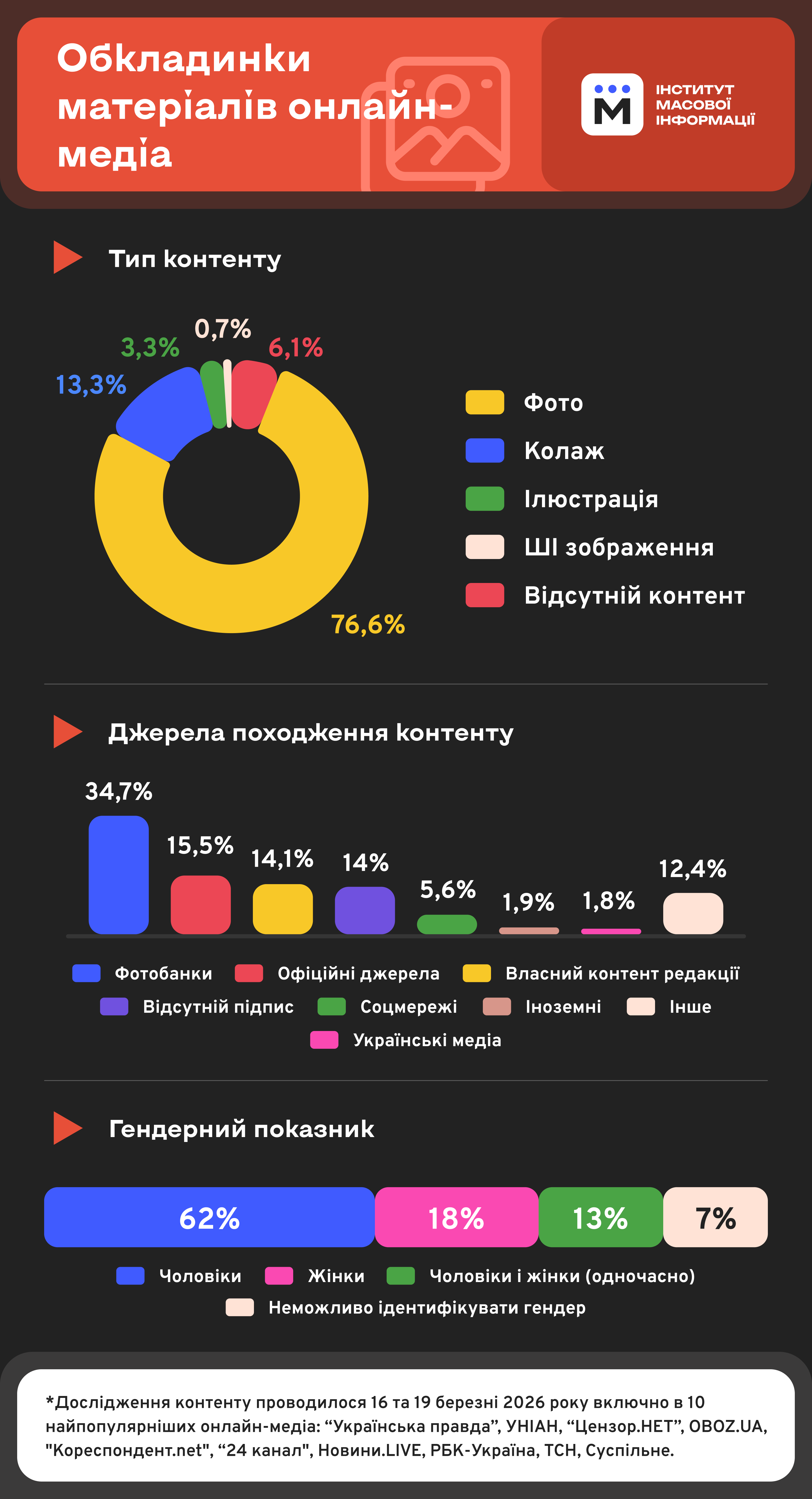 *Дослідження контенту проводилося 16 та 19 березня 2026 року включно в 10 найпопулярніших онлайн-медіа: “Українська правда”, УНІАН, “Цензор.НЕТ”, OBOZ.UA, “Кореспондент.net”, “24 канал”, Новини.LIVE, РБК-Україна, ТСН, Суспільне.