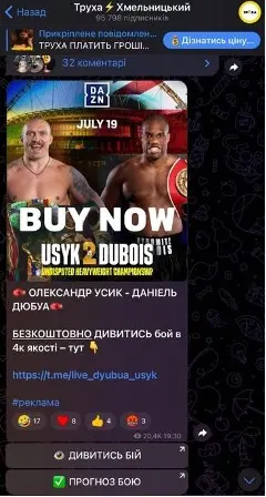Загалом за місяць ми зафіксували не менш ніж 25 випадків поширення контенту, спрямованого на залучення нових читачів. Чотири рази телеграм-канал поширював рекламний допис із непристойним маніпулятивним контентом та зі згадкою російських військових, відео про побиття військового, ще чотири рази – про підготовку до можливого масованого ракетного удару. Усі ці дописи спрямовували читачів на підпис в інші закриті телеграм-канали. Також канал використав інформаційний привід бою між Олександром Усиком та Даніелем Дюбуа 19 липня, а саме можливість безкоштовної трансляції, щоб зацікавлені читачі підписувалися на канали, які рекламуються. Маніпуляція щодо підписки на канали, які нібито мали вести трансляцію бою, полягала в тому, що йшлося лише про отримання нових підписників, бо ніхто в той час не міг робити трансляцію бою. Варто уточнити, що трансляцію робив лише один медіасервіс для перегляду телеканалів і лише за умови платної підписки на один з найдорожчих тарифів.