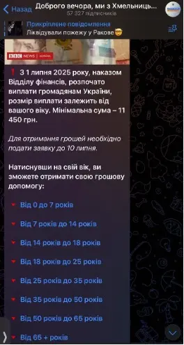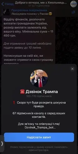 Допис про нібито виплати громадянам України та посилання на канал “Дзвінок Трампа”. Скрини: “Доброго вечора, ми з Хмельницького”