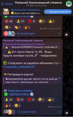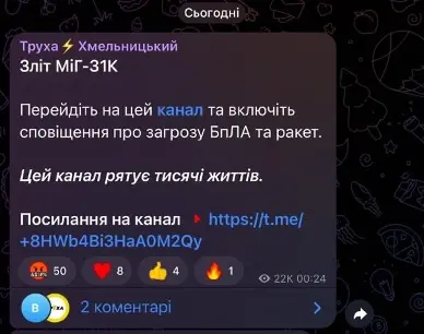 Менш ніж за годину телеграм-канал розмістив новий допис про зліт МІГа із закликом увімкнути “сповіщення про загрозу БпЛА та ракет” з посиланням на власний телеграм-канал “Труха Україна” (понад 3,38 мільйона підписників).