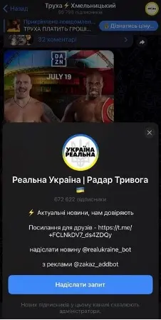 Допис про можливість “безкоштовного” перегляду бою через підписку на канал “Реальна Україна | Радар Тривог”. Скрини: “Труха Хмельницький”