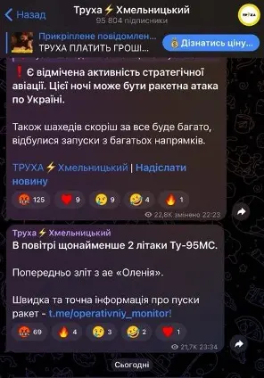 Телеграм-канал також опублікував інформацію про траєкторію руху ракет чи БпЛА з посиланням на “Труха Україна” і посилання на споріднені канали “Доброго вечора, ми з Києва”, “Доброго вечора, ми з Полтави” та “Доброго вечора, ми з Сум”, коли міста зазнавали ворожих атак.