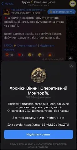 Допис про перебування літаків ворога в повітрі й заклик отримувати інформацію в каналі “Хроніки Війни | Оперативний монітор”. Скрин: телеграм-канал “Труха Хмельницький”