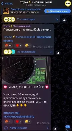 О 3:47 на каналі повторили допис, у якому повідомили про “нові крилаті ракети на Харківщині” й розмістили згадку про “моніторинг руху ракет у реальному часі” з посиланням на вже згадуваний канал “Хроніки Війни | Оперативний монітор”. Ще через годину, о 4:51, серед сповіщень про рух ракет розміщується допис, що миттєві сповіщення про небезпеку можна отримувати з резервного каналу – “Доброго вечора, ми з Хмельницького”, мережевого каналу, який є сателітом “Трухи”.