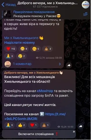 Допис про важливість увімкнення сповіщення через канал “єМонітор”. Скрин: “Доброго вечора, ми з Хмельницького”