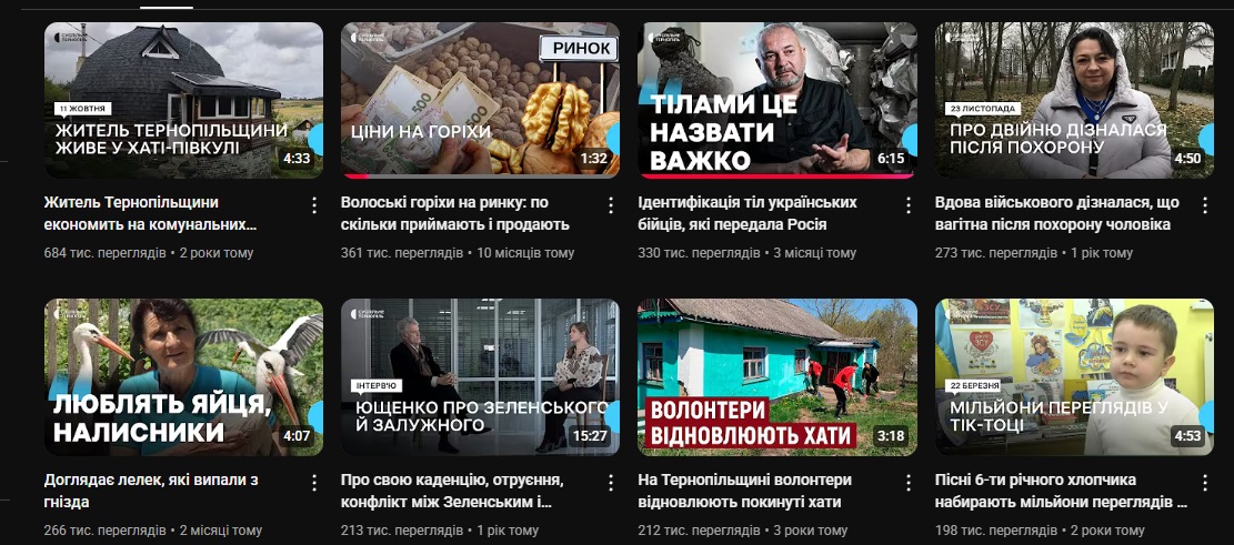 Серед найпопулярніших за роки існування каналу – матеріал “Житель Тернопільщини економить на комунальних послугах у своїй хаті-півкулі”, який вийшов у жовтні 2022 року і має понад 684 тисячі переглядів. Крім цього, в лідерах і торішній матеріал про ціну на волоські горіхи – його переглянули 361 тисячу разів, і цьогорічний – про ідентифікацію тіл українських захисників (330 тисяч).