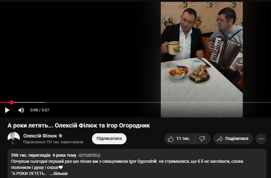 Найпопулярнішим на каналі є відео з піснею “А роки летять”, що має 585 тисяч переглядів. Його опублікували в березні 2021 року, там Олексій Філюк співає пісню, як сам указує в описі, з іншим священником Ігорем Огородником.