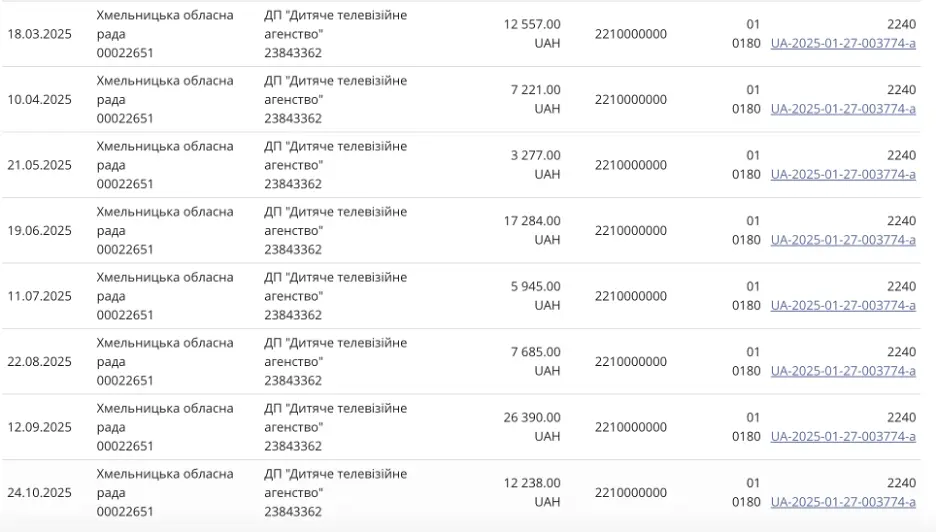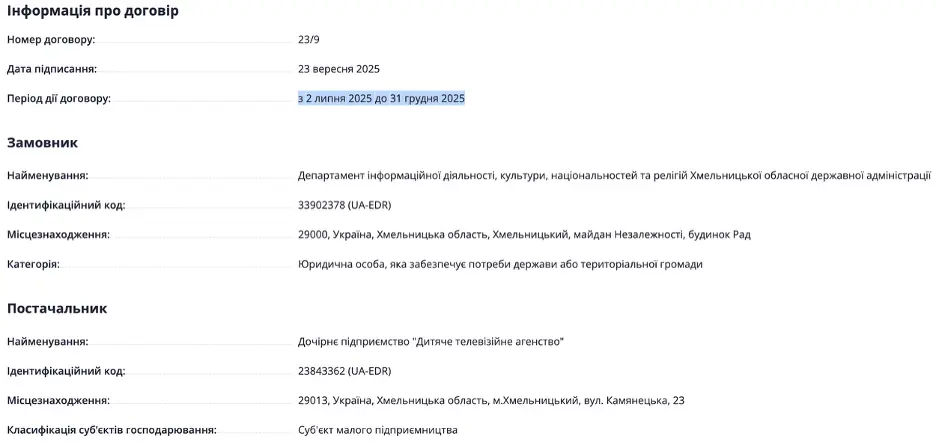 23 вересня департамент інформаційної діяльності, культури, національностей та релігій підписав договір на розміщення інформації на телебаченні з дочірнім підприємством “Дитяче телевізійне агентство” (33 канал) на 20 695 гривень. Особливість договору в тому, що він датується “з 2 липня 2025 до 31 грудня 2025” року, тобто охоплює час раніше, ніж був підписаний. Сам договір у Prozorro не оприлюднено.