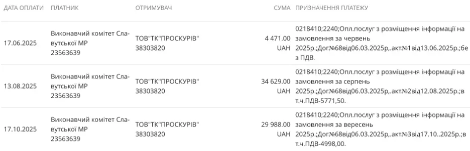 Водночас 2025 року виконавчий комітет Славутської міської ради офіційно оплачував послуги з висвітлення діяльності телеканалу ТВ7+ (ТОВ “Телекомпанія “Проскурів”), вже здійснивши проплати на понад 69 тисяч гривень. Останню з них, на майже 30 тисяч гривень, здійснено 7 жовтня 2025 року.