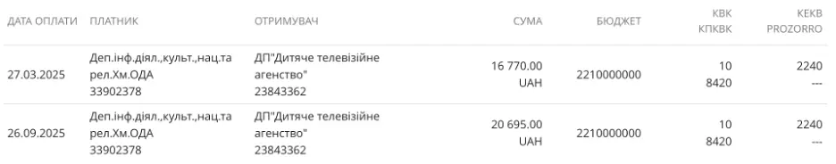 Інформація про оплати, які отримав канал “Перший Подільський”. Скриншот: Є-дата