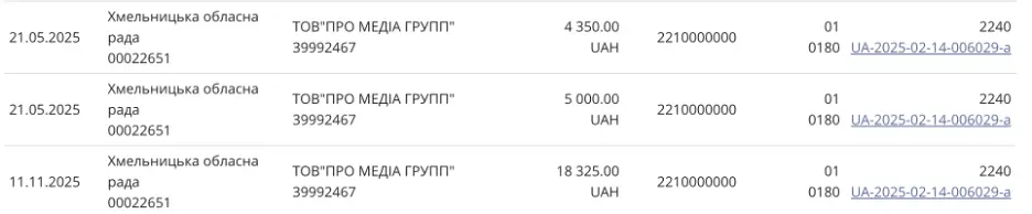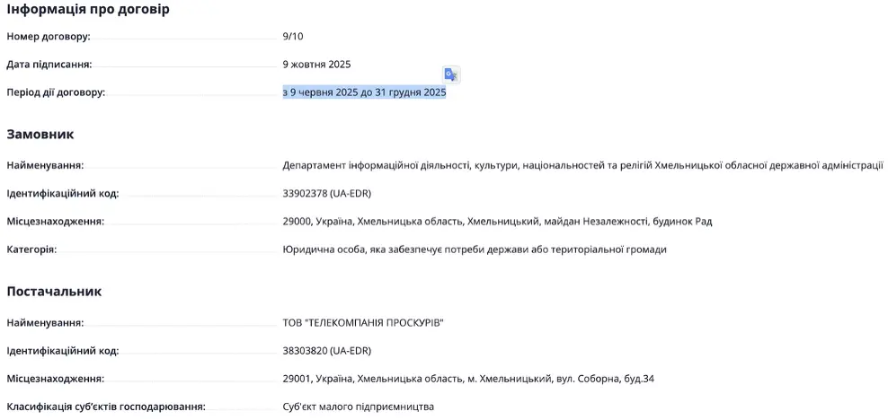 9 жовтня профільний департамент підписав договір на розміщення інформації на телебаченні з ТОВ “Телекомпанія “Проскурів” (телеканал ТВ 7+) на 12 300 гривень. Його дія “з 9 червня 2025 до 31 грудня 2025” тобто договір також передбачає покриття розміщення інформації ще з початку червня. Самого договору в системі теж немає.