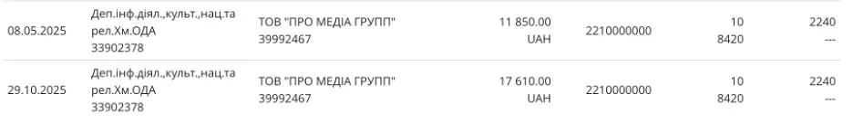 27 жовтня департамент підписав договір на розміщення інформації з телеканалом “Перший Подільський”. Йдеться про 17 610 гривень, а період дії аналогічний попереднім: з 2 травня 2025 до 31 грудня 2025 року.