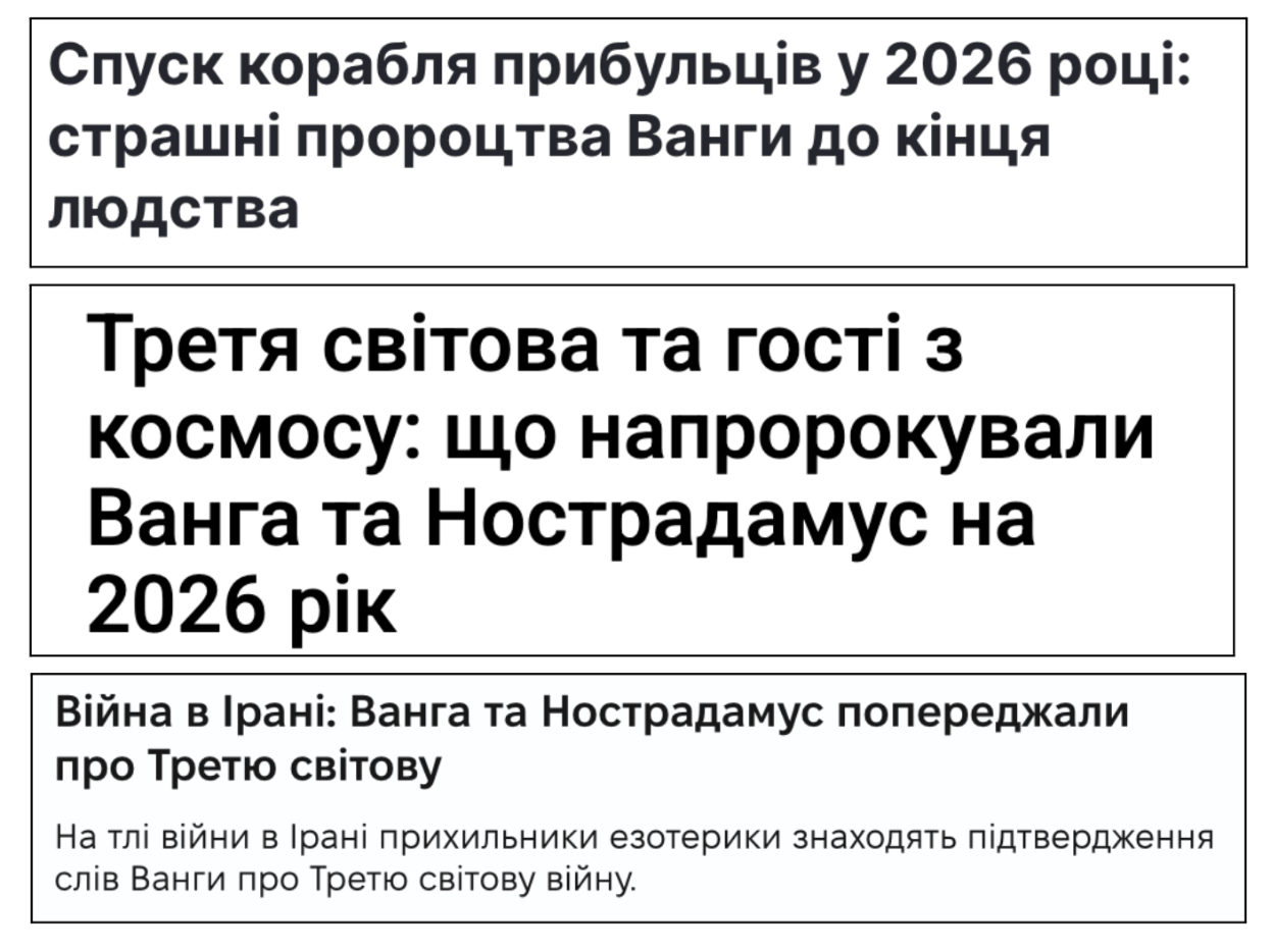 Традиційно певні українські онлайни рясніють апокаліптичними матеріалами, які намагаються пояснити, що причини всіх бід уже давно обґрунтовано пророцтвами Ванги чи Нострадамуса. У цих заголовках завжди будуть згадки про війну, вигадані трагічні інфоприводи для України, прибульців та тренди, як наразі про “Третю світову війну”. Тексти самих таких псевдопророцтв завжди побудовано за однаковою схемою – розмите висловлювання, яке можна інтерпретувати щонайменше п’ятьма різними сценаріями, втім редакції впевнено їх приплітають до актуальних новин. Ті редакції, які добре розуміють смаки своєї цільової аудиторії, знайдуть втішні чи тригерні висловлювання начебто зі слів пророків чи ясновидців.