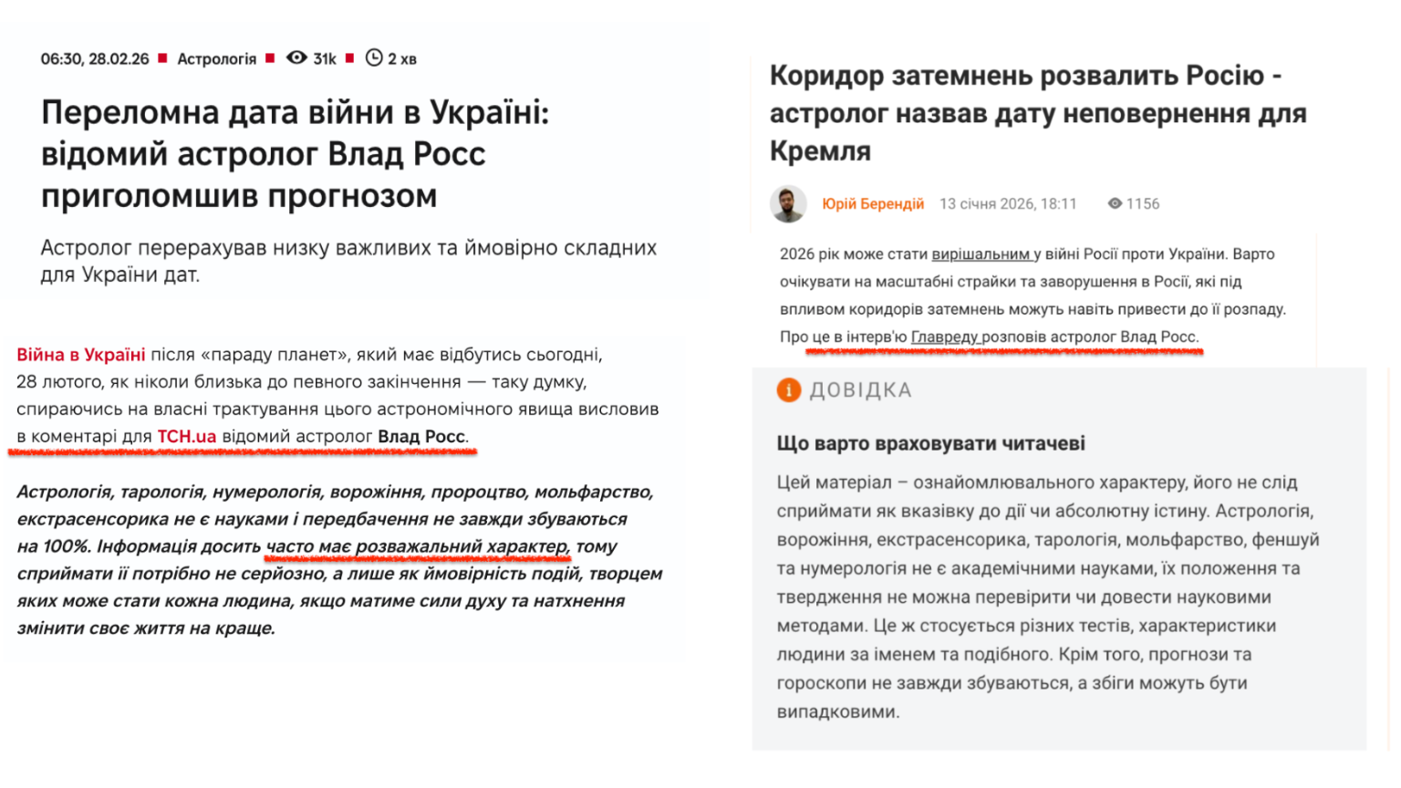 У перші роки повномасштабної війни тільки ліниві езотерики не вангували швидке закінчення війни, смерть Путіна та кардинальний розпад Росії. Втім, усе це ніяк не відбувається, тому астрологи перейшли на спокійніші передбачення, щоб уникнути репутаційних ризиків. Однак є цікаві випадки, коли редакції звертаються по експертний коментар до астролога для ексклюзивного матеріалу, але для перестрахування додають дисклеймер, що езотеричні матеріали мають лише розважальний характер.