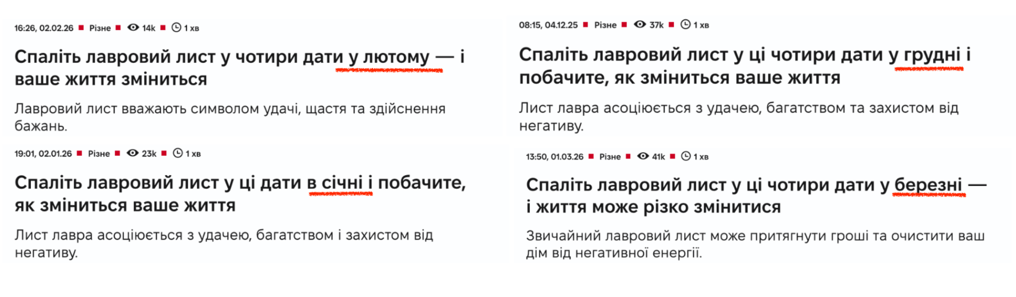 Тут можна було б пожартувати про “полтавського палія”, але є нюанс щодо редакційної практики. Аудиторію, яка щомісяця приносить від 14 до 41 тисячі переглядів, не бентежить факт, що редакція щоразу публікує той самий текст, змінюючи лише дати ритуалів.
