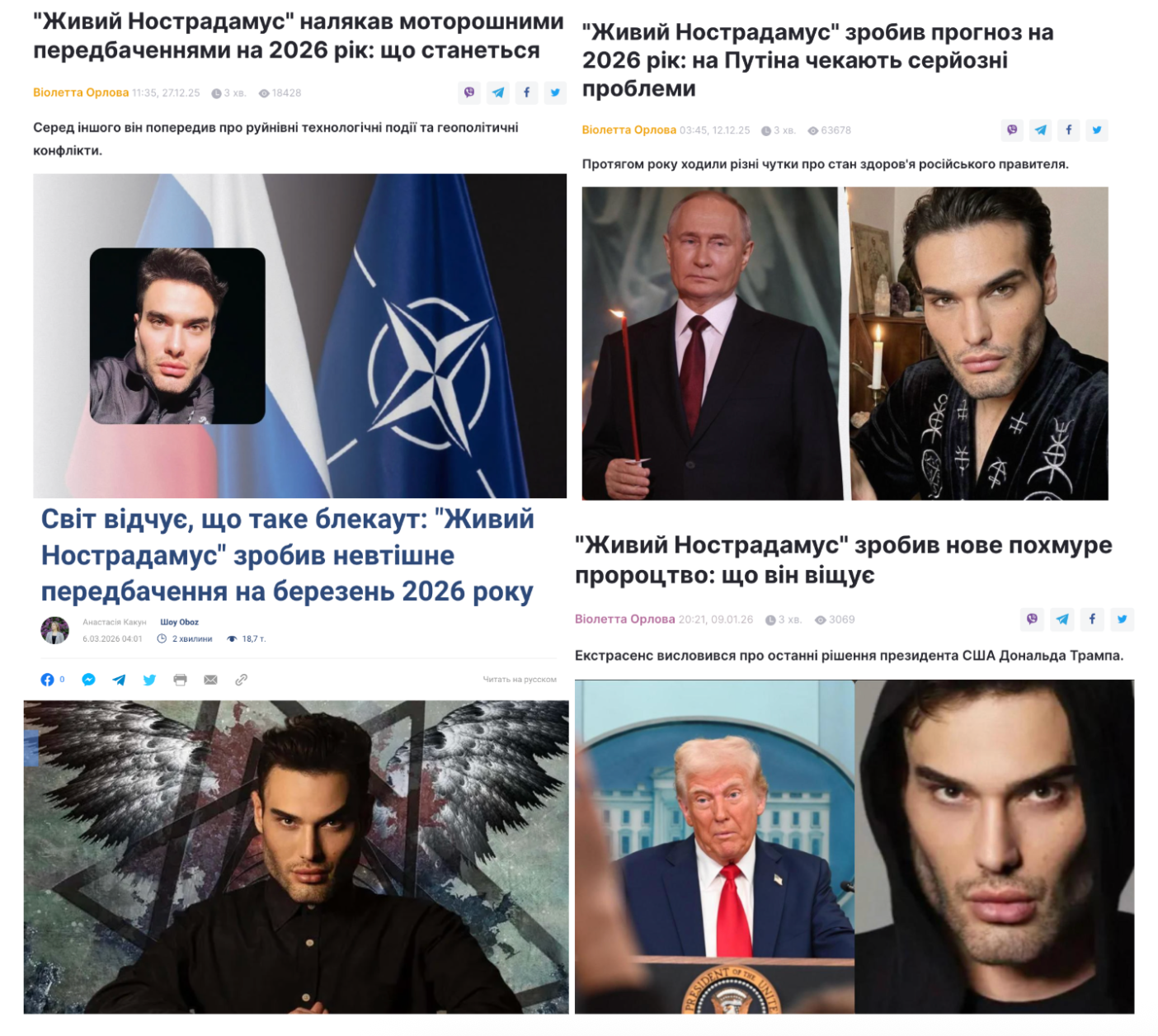 Не менш кумедний вигляд мають колажі в медіа, коли поєднуються зображення політиків і таблоїдного астролога. Такий візуальний клікбейт приносить редакціям десятки тисяч переглядів.