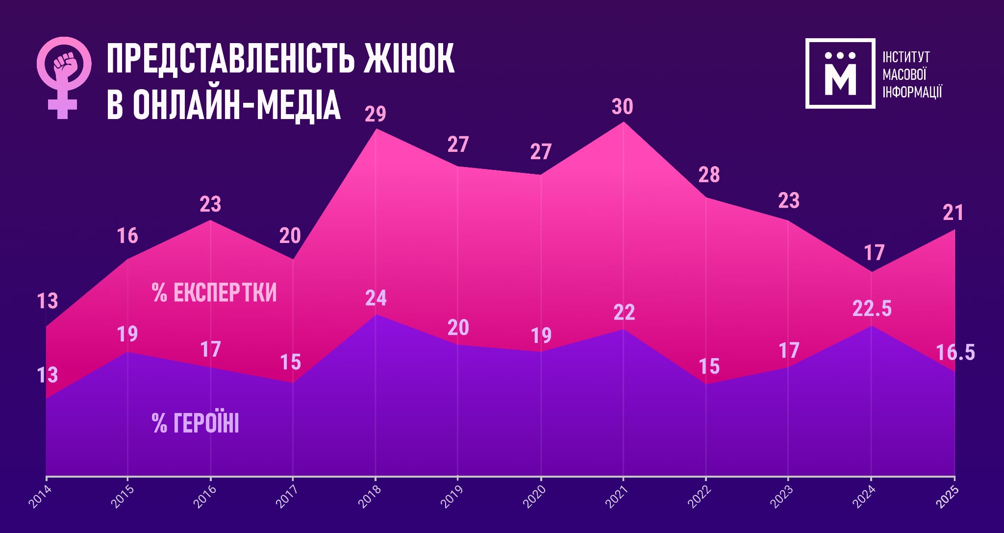 Аналізуючи результати гендерного балансу в українських онлайн-медіа, Інститут масової інформації (ІМІ) простежує стійку тенденцію низької представленості жінок як експерток і героїнь публікацій. За підсумками щорічного моніторингу ІМІ, у 2025 році жінки як експертки траплялися у 21% матеріалів, а як героїні – у 16,5%. Це суттєво нижчі показники, ніж 2021 року (до повномасштабного вторгнення), коли експертки з’являлись у 30% матеріалів, а героїні – у 22%.