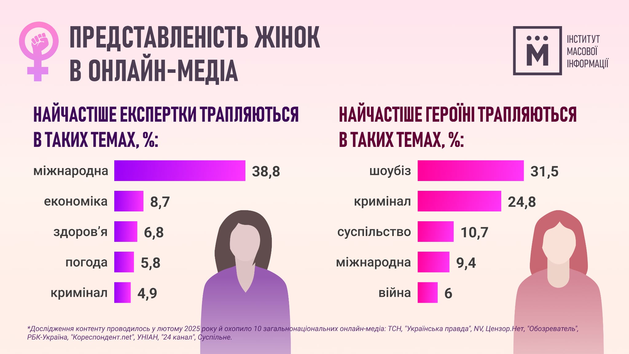 Щодо героїнь матеріалів, найбільшу їхню частку зафіксовано в тематиці шоубізнесу (31,5%) та кримінальної хроніки (24,8%). Оскільки більшість героїнь публікацій зосереджені в матеріалах про шоубізнес і кримінальні події, це означає, що медіа відтворюють та закріплюють гендерні стереотипи серед аудиторії. Частка жінок у суспільно-політичних матеріалах залишається низькою – у межах 10–12%.