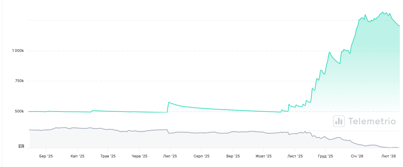 До прикладу, до початку масового накручування, станом на 1 листопада 2025 року, канал мав 535 тис. підписників за показника залученості (ER) 22,3%. Протягом наступних трьох місяців (станом на 1 лютого 2026 року) кількість аудиторії зросла більш ніж удвічі (1,28 млн). Водночас показник ER за цей період знизився до 7,24%. Такий розрив між темпами приросту підписників і падінням залученості є показовим. Якщо зростання відбувається органічно, через реальну цікавість до контенту, тоді рівень взаємодії зазвичай залишається стабільним.