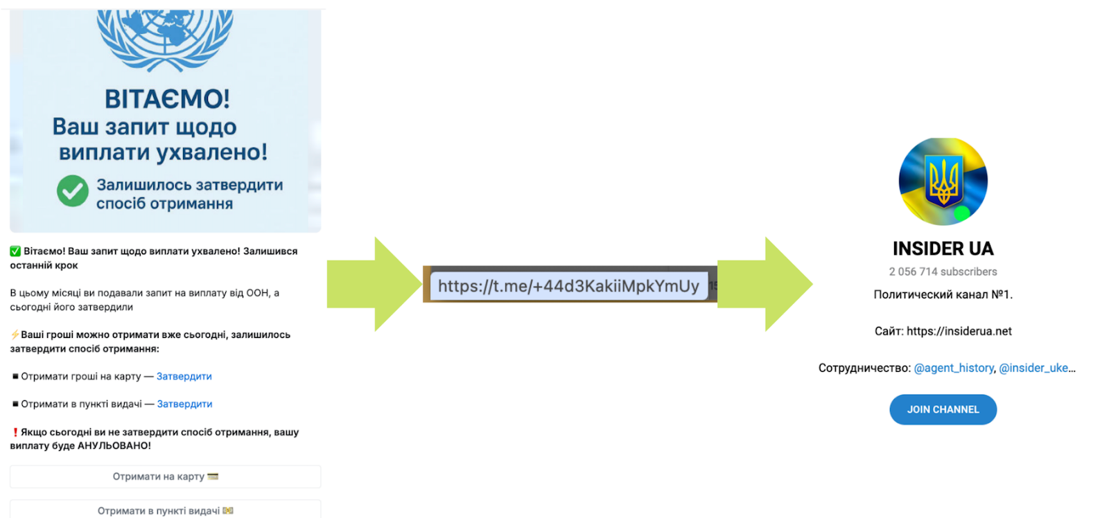 Ось саме з таких повідомлень може відбутися перший контакт користувачів з обіцянками про легкі гроші в телеграмі. Натрапити на такі повідомлення в телеграм-каналах досить легко: необхідно підписатися на анонімні канали, і неважливо, чи це локальна група міста, чи мільйонний канал або тематична група. Новинна стрічка таких каналів досить звичайна: пости про війну, обстріли, трішки криміналу, навіть може бути джинса чи маніпуляція, а згодом можна натрапити на пост про нібито “зарахування коштів” від відомих державних інституцій, міжнародних організацій або начебто від Зеленського. Єдина схожість таких повідомлень про виплати – заклик до негайного переходу за посиланням, без жодних деталей, чому ці гроші дають.