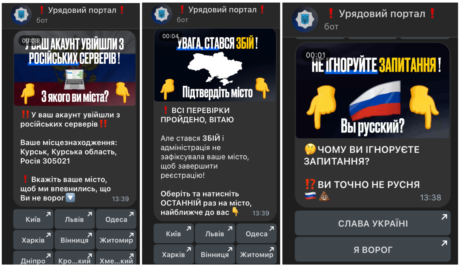 На цьому етапі з’являються різні питання, деякі не мають жодного стосунку до виплат, але побудовані як термінові та тригерні повідомлення: “Ви точно людина?”, “Підтвердіть місто”, “Ви точно пенсіонер?” або “Ви русня?”. Згодом може з’явитися повідомлення про те, що стався збій, і питання повторюються заново. Такі формулювання створюють психологічний тиск і змушують користувача відповідати, щоб завершити перевірку.