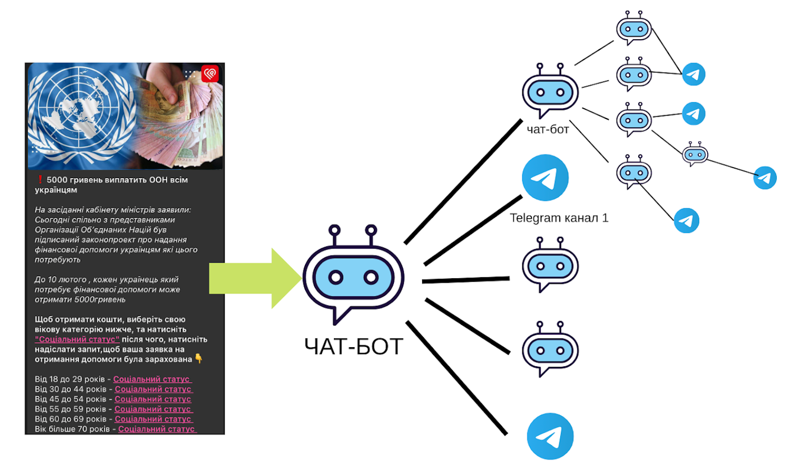 Анонімні телеграм-канали поширюють щодня тисячі повідомлень з яскравими закликами, що гроші “чекають тебе”, необхідно лише клікнути. Згодом користувачі переходять за посиланням, проходять “перевірку” в бота. Повідомлення про обіцяні виплати зникають, натомість користувач залишається з десятком нових каналів, телефон не затихає від сповіщень, а обіцяних грошей немає.
