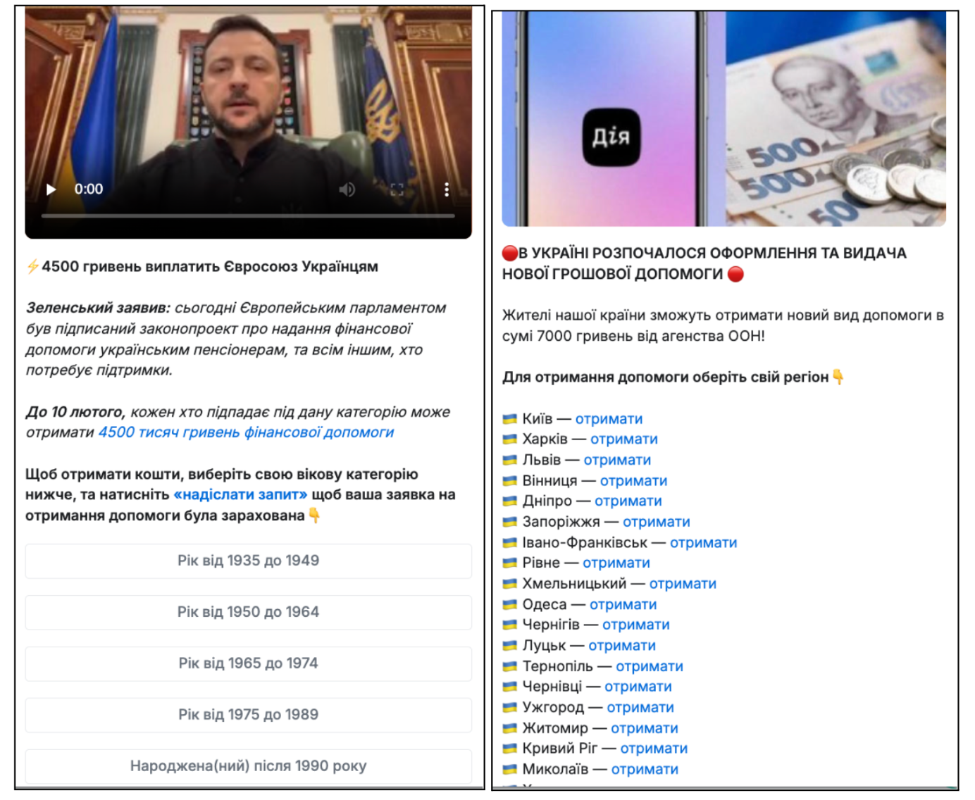 “Ви отримали зарахування на ваш онлайн-рахунок”, “💳+4722.00UAH Виплати Пенсійного фонду, надбавка до пенсії” або ж “ООН оголосила про поновлення виплат 10800 грн всім українцям”.