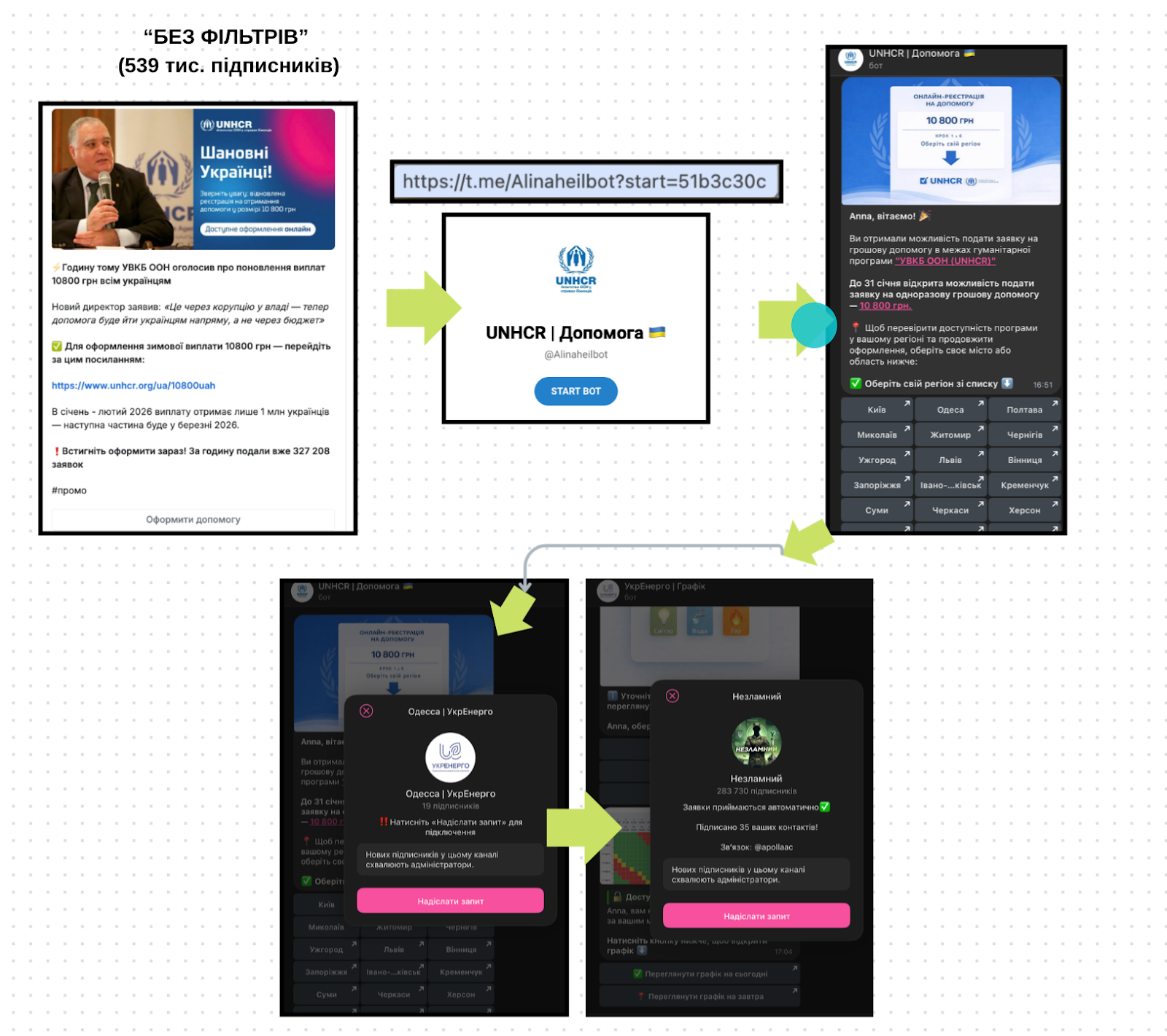Так, в одному з випадків аналітики ІМІ спробували перейти за начебто посиланням на сайт ООН, але насправді під текстом ховалося посилання на чат-бот у телеграм-каналі, звідти чат-бот перекидав між ботами та іншими телеграм-каналами, які в такий спосіб нарощували собі підписників.