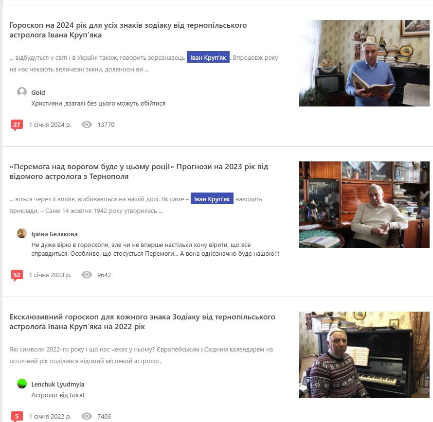 Ще кілька років тому в місцевих медіа було популярним робити астрологічний прогноз на прийдешній рік. Найчастіше коментував їм такі передбачення місцевий астролог і “космопсихолог” Іван Круп’як. Наприклад, на сайті тернопільського медіа “20 хвилин” ми знайшли кілька таких матеріалів. У січні 2023-го пан Круп’як розповідав, чи буде того року перемога. І, судячи із заголовка “Перемога над ворогом буде у цьому році!” Прогнози на 2023 рік від відомого астролога з Тернополя”, казав, що таки так. Щоправда, в тексті він це лише припускав: “Я гадаю, що вона (перемога. – Прим.) якраз припаде на новий рік, адже це рік сімки, а вона завжди для нашої долі знакова! Коли точно настане Перемога – напевно ніхто не скаже…”