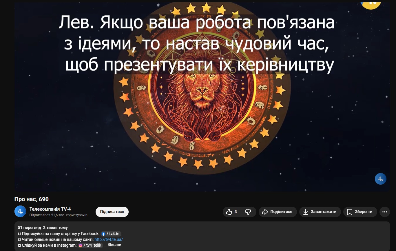 На Тернопільщині чотири медіа створюють телевізійний контент: Суспільне, ІНТБ, “Тернопіль 1” і TV-4. На Суспільному матеріалів про астрологію і містику немає. В ІНТБ і “Тернопіль 1” новинний контент ідентичний, дещо відрізняються програми.