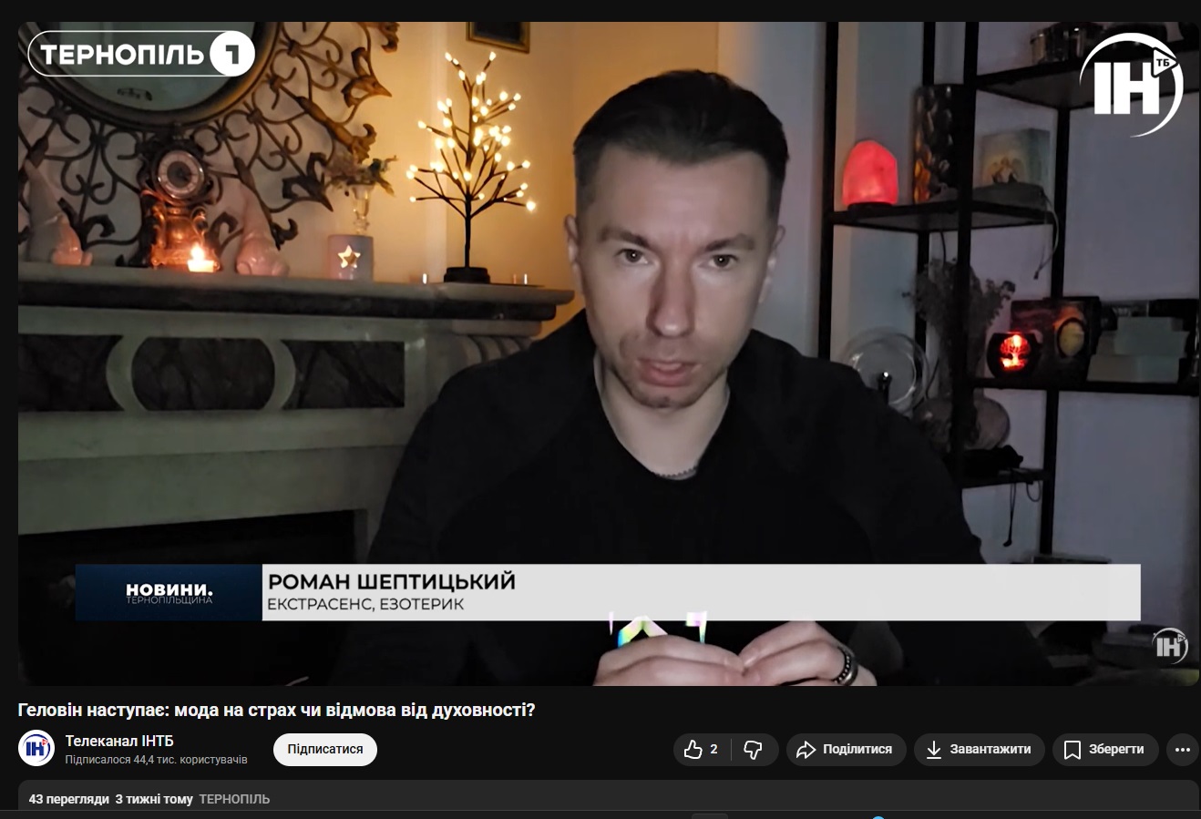 Але повернемося до програми з екстрасенсом Шептицьким. На ютуб-сторінці телеканалу вона має понад 48 тисяч переглядів від 31 жовтня. У короткому бліці на початку програми він каже, що він і екстрасенс, і білий маг, а також називає себе духовним наставником, ментором, вчителем. “Вірніше, мене так називають мої дорогі глядачі”, – розповідає, додаючи, що він також “езотерик і архітектор сценаріїв”.