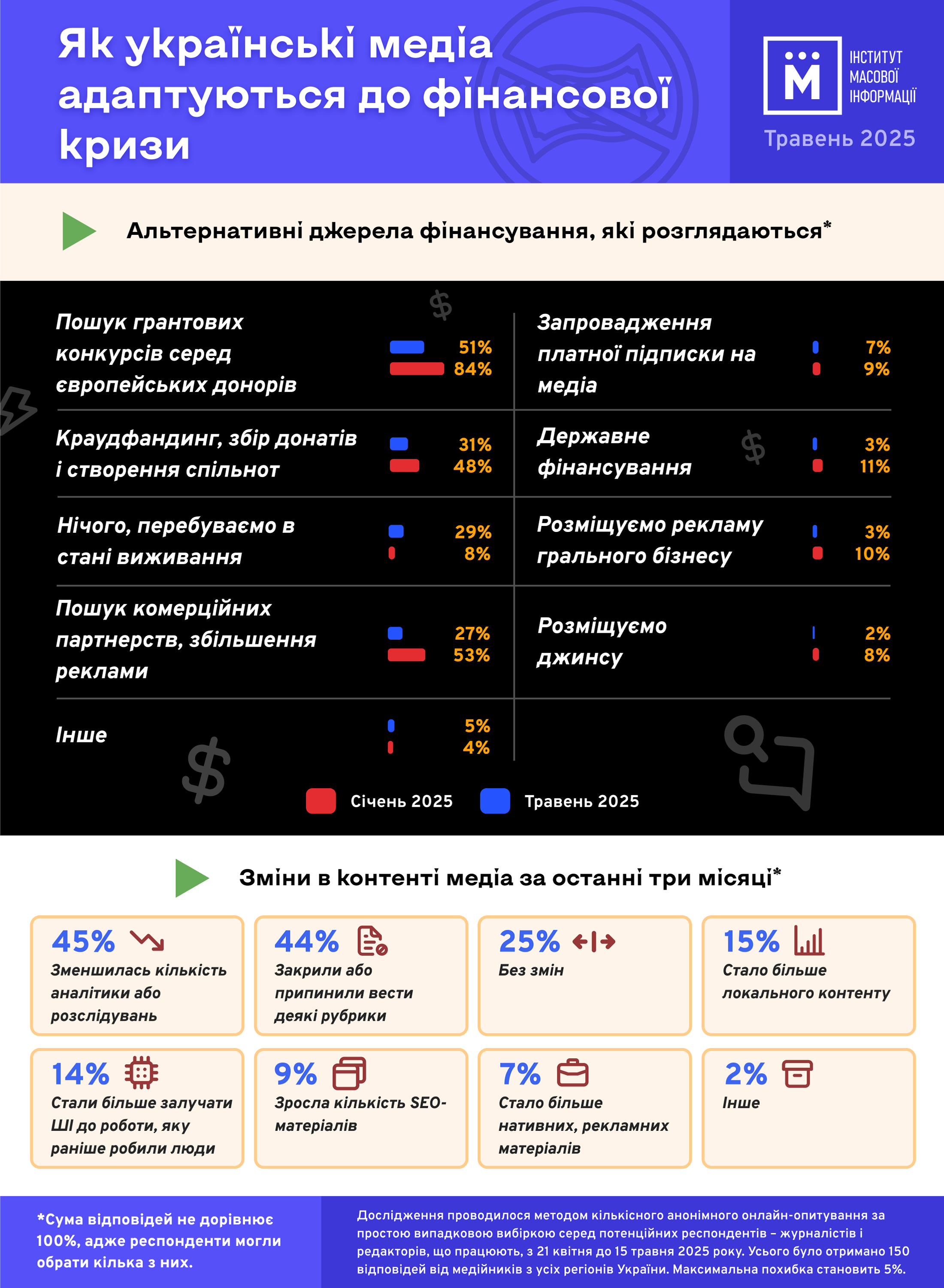 Важливо! У цьому опитуванні ми порівнюємо результати з аналогічним опитуванням, яке ІМІ проводив одразу після раптового зупинення фінансування США, у січні – лютому 2025 року. Таке порівняння дозволяє оцінити, як змінюються очікування та реальні дії медіа у відповідь на кризу, а також виявити ступінь адаптації ринку до нових умов. Воно показує, які антикризові механізми виявились ефективними, а де ситуація, навпаки, погіршилася. Це дає змогу сформувати обґрунтовані рекомендації для донорів, медіаспільноти та держави щодо підтримки незалежної журналістики.