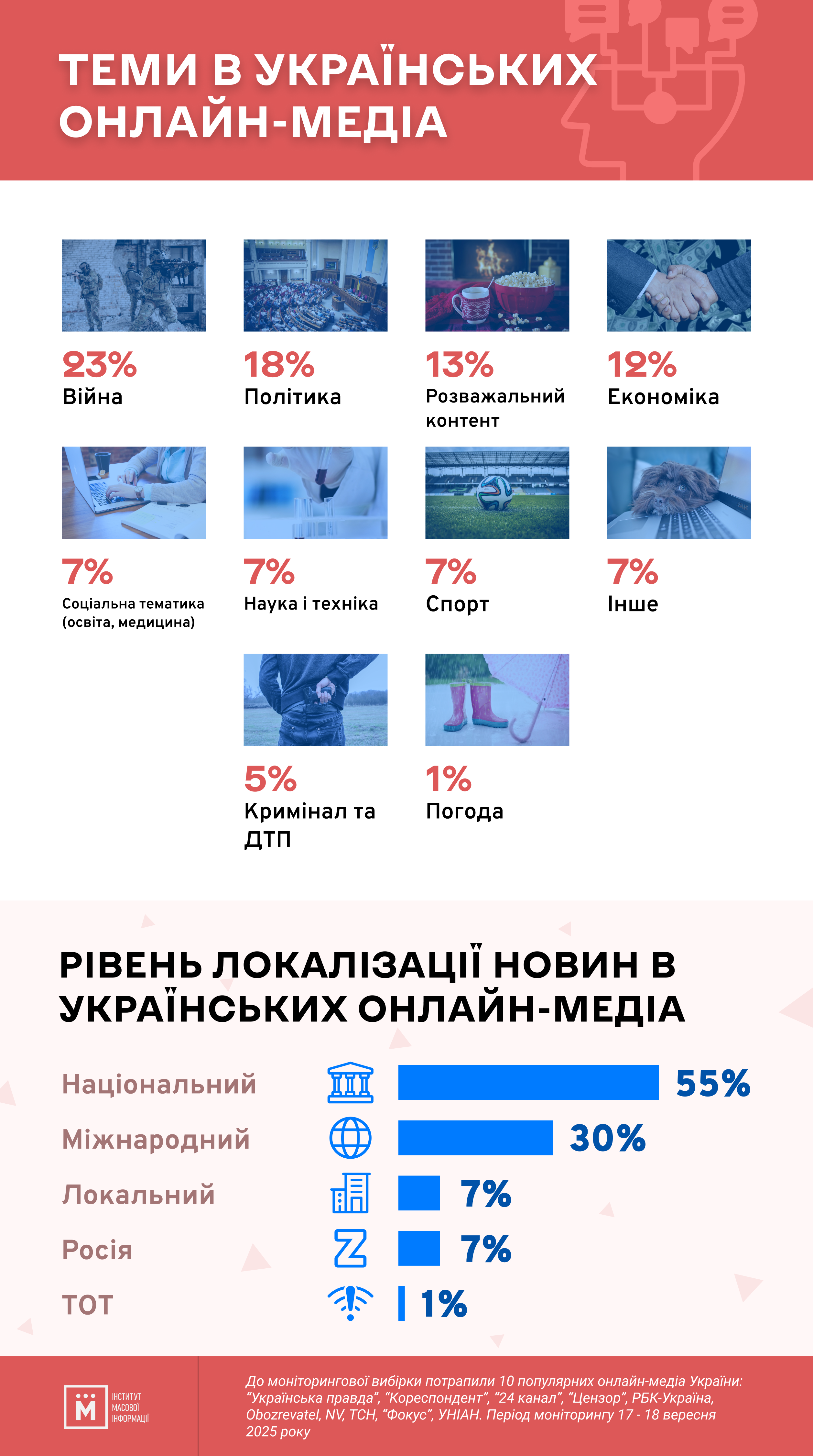Ядро порядку денного медіа формують війна, політика та економіка (сукупно близько 53% матеріалів у медіа припадає на ці тематики). Моніторинг онлайн-медіа, проведений Інститутом масової інформації у вересні 2025-го*, показує, що редакції тримають стабільний фокус на рішеннях держави й динаміці фронту як ключових драйверах попиту аудиторії та суспільної безпеки. Водночас помітна частка розважального контенту виконує функцію такого собі розвантаження стрічки. Редакції свідомо змішують важкі теми з легшими, щоб утримувати увагу аудиторії й збільшити час споживання.