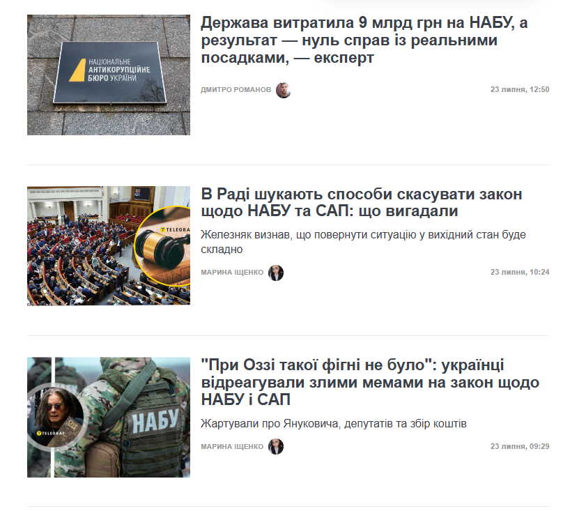 - “Громадськість відреагувала на ухвалення Радою скандального закону щодо НАБУ і САП: у Києві організовують акцію протесту” (Рубрика)