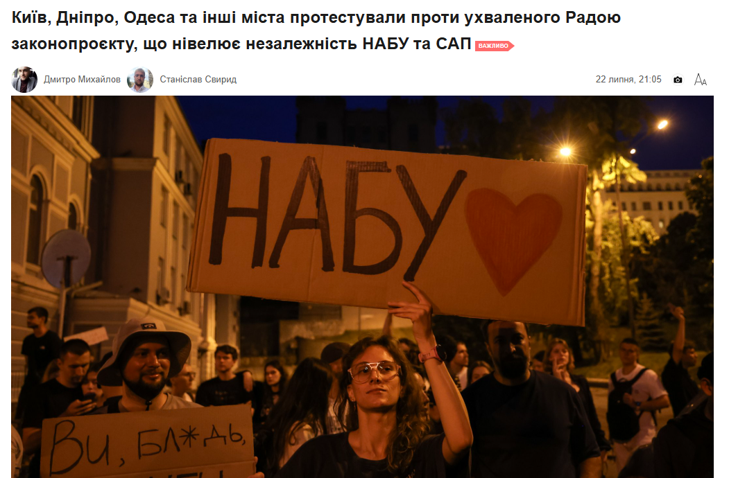 - “У найбільших містах України розпочали протести проти законопроєкту, який обмежує роботу НАБУ і САП” (Бабель)