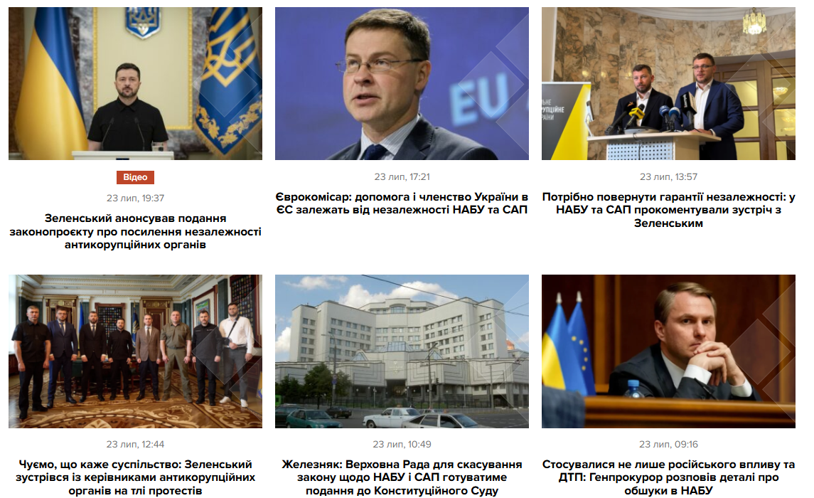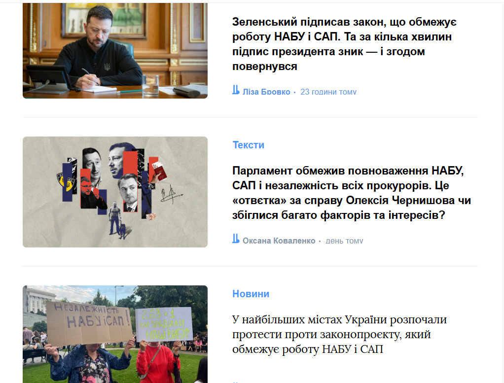- “Київ, Дніпро, Одеса та інші міста протестували проти ухваленого Радою законопроєкту, що нівелює незалежність НАБУ та САП” (Суспільне)