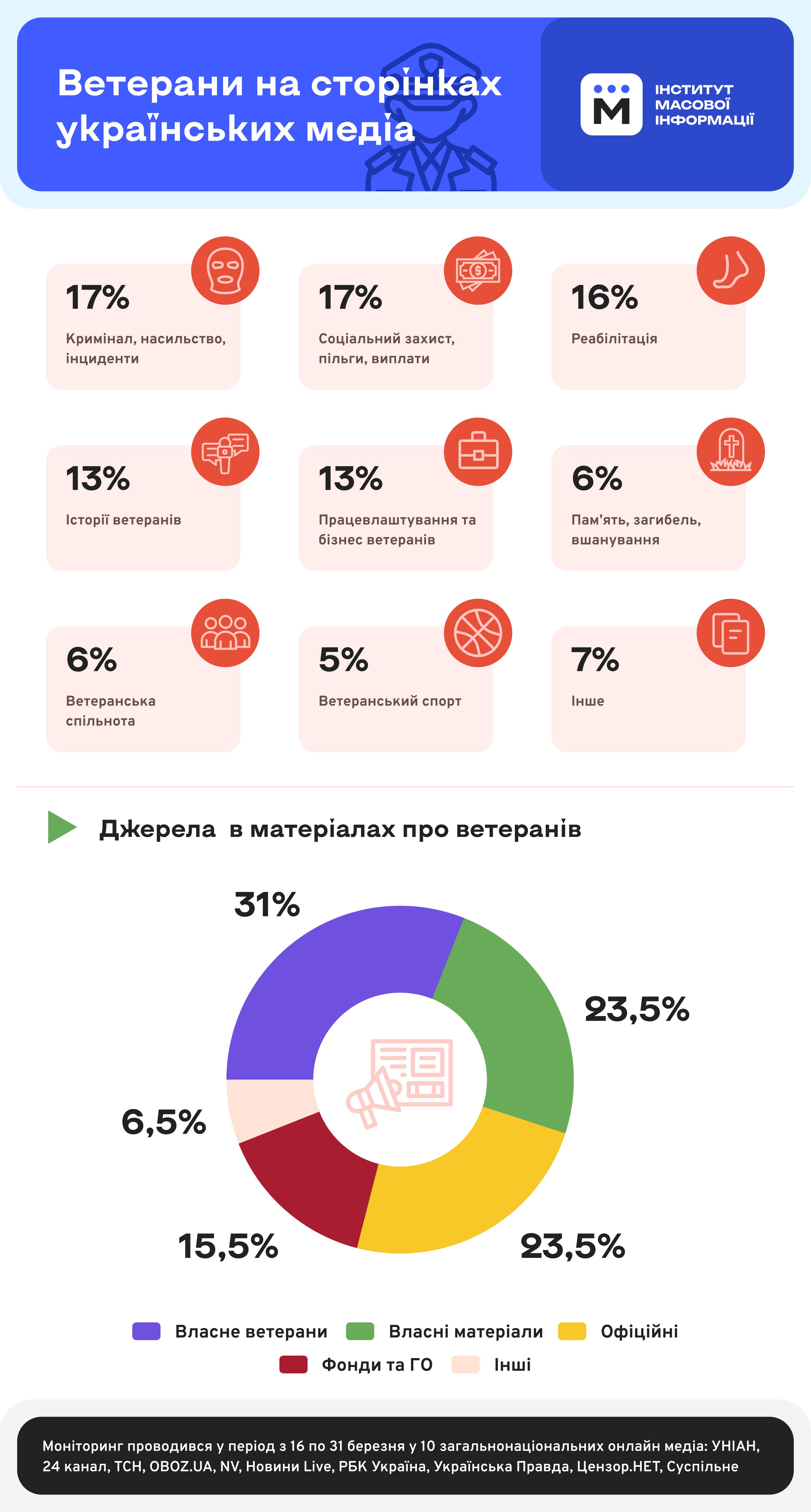 Медіа багато пишуть про ветеранів, однак здебільшого йдеться або про злочини щодо них, або про пільги й соціальну підтримку. Як показало дослідження Інституту масової інформації, у такому висвітленні ветеран зрідка постає як суб’єкт, частіше його показують як об’єкт допомоги, співчуття або благодійності.