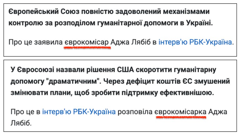 Один із прикладів на сайті “РБК-Україна”, коли одну й ту саму експертку титрували “єврокомісар” та “єврокомісарка”.