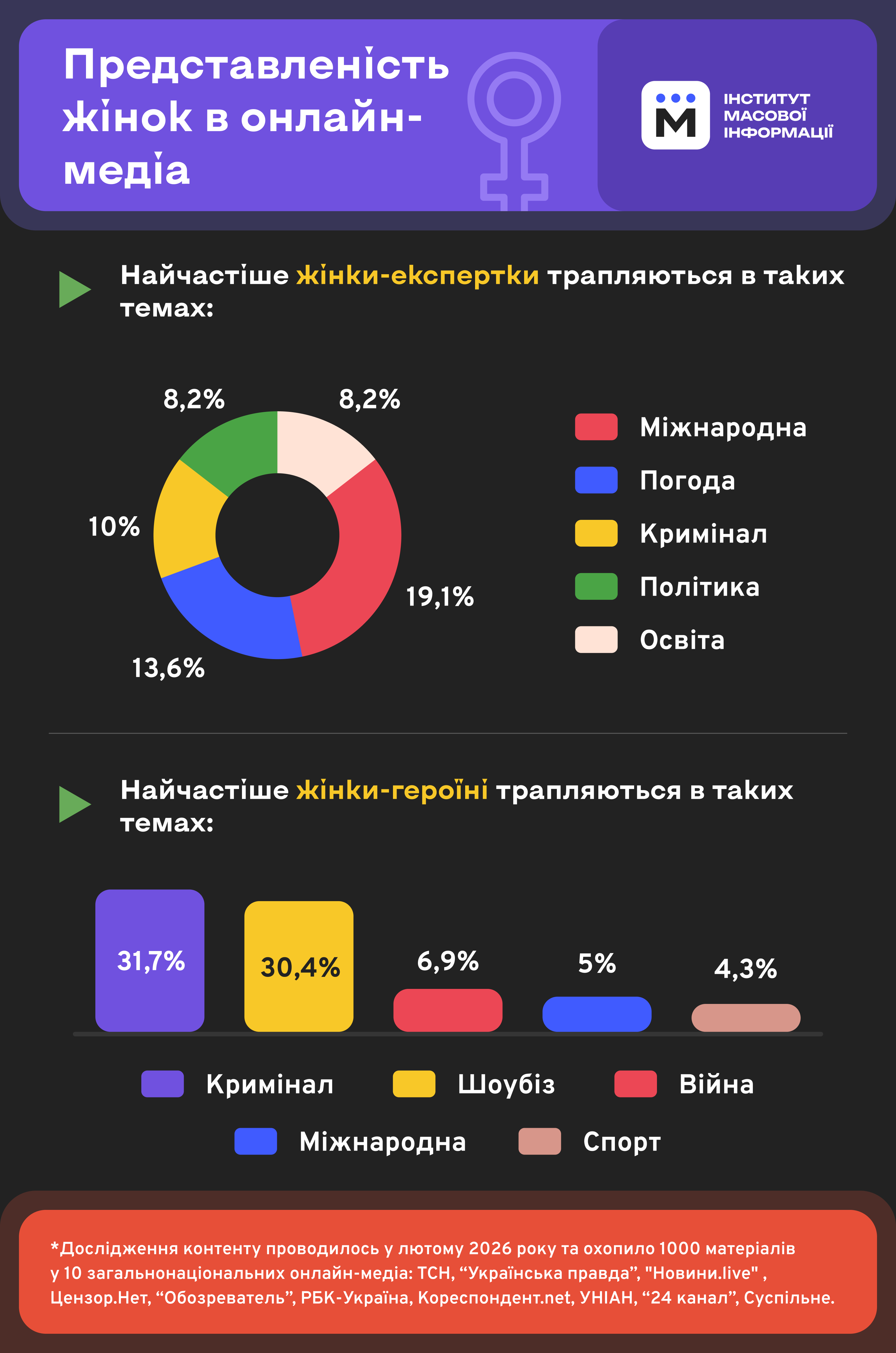 *Дослідження контенту проводилось у лютому 2026 року та охопило 1000 матеріалів у 10 загальнонаціональних онлайн-медіа: ТСН, “Українська правда”, Новини.live, Цензор.Нет, “Обозреватель”, РБК-Україна, Кореспондент.net, УНІАН, “24 канал”, Суспільне.