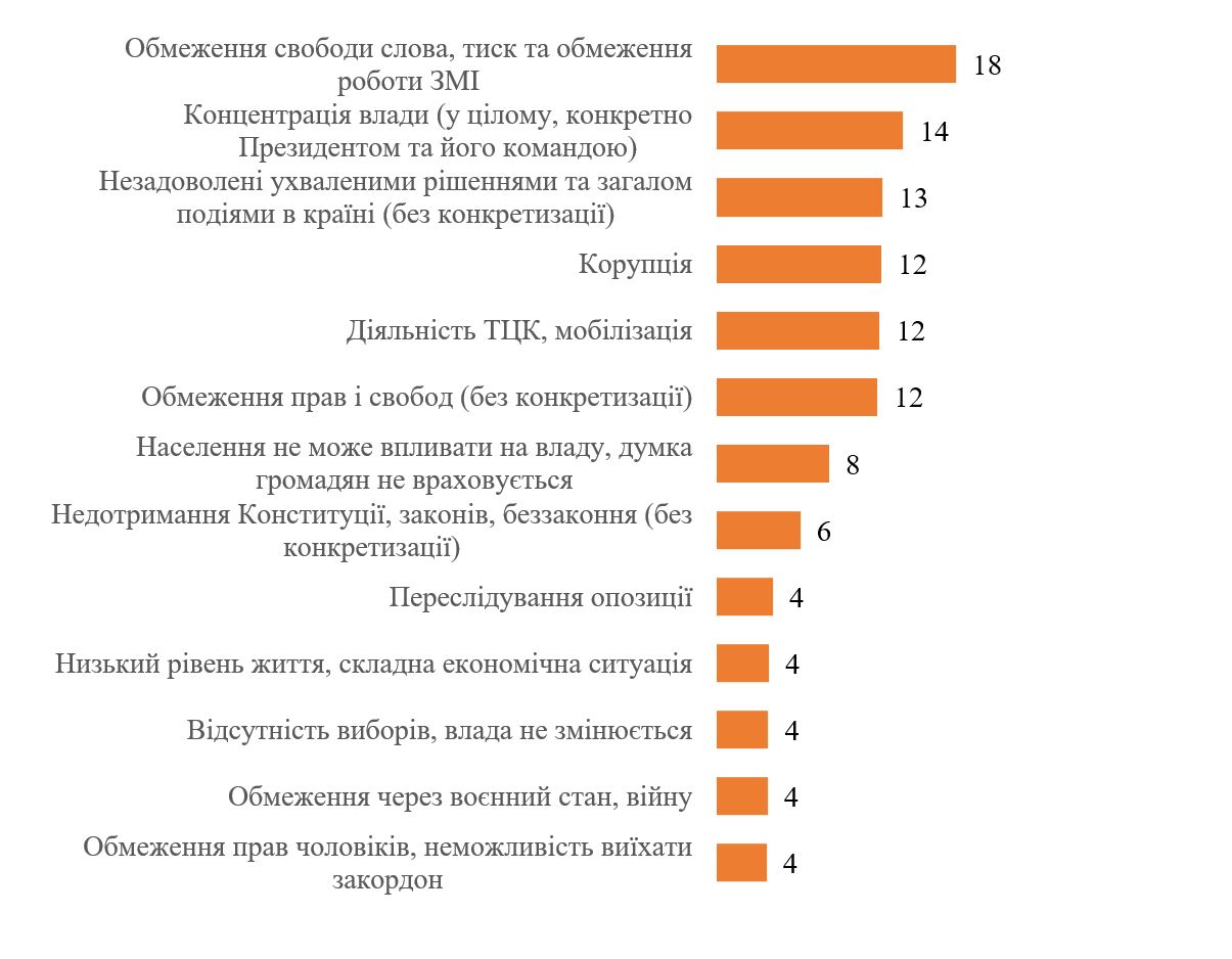 - обмеження свободи слова і тиск на медіа (18% серед тих, хто вважає, що країна рухається до авторитаризму);