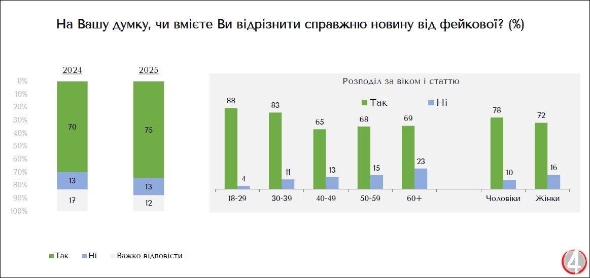 За результатами дослідження, 75% опитаних рівнян вважають себе здатними відрізнити справжню новину від фейкової. Найчастіше це молодь та чоловіки.