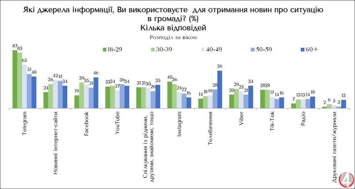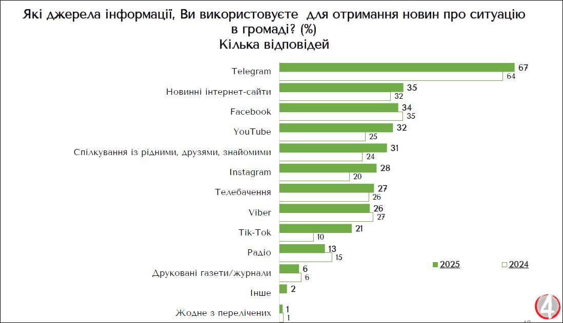 Основним джерелом місцевих новин є Telegram (67%). Близько третини респондентів використовують новинні сайти, Facebook, YouTube, спілкування зі знайомими.