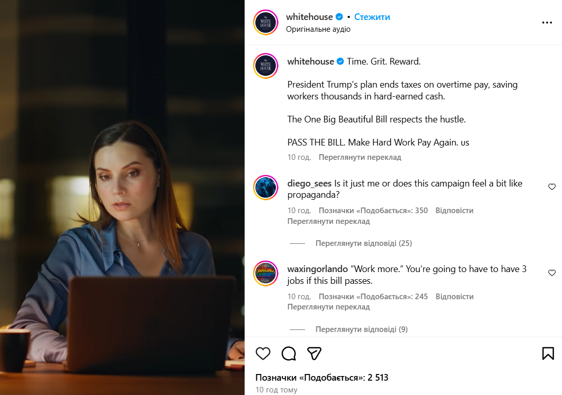 “Час. Витримка. Винагорода. План президента Трампа скасовує оподаткування оплати понаднормової роботи, що заощадить працівникам тисячі важко зароблених грошей. “Єдиний великий прекрасний закон” поважає гарування. Голосуйте за цей закон. Зробімо тяжку роботу знову вигідною”, – йдеться в дописі.