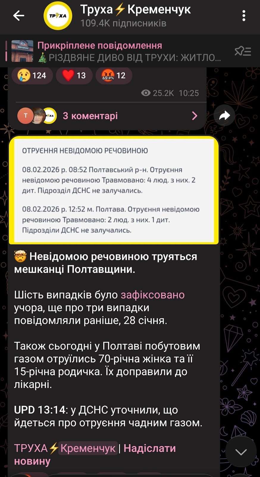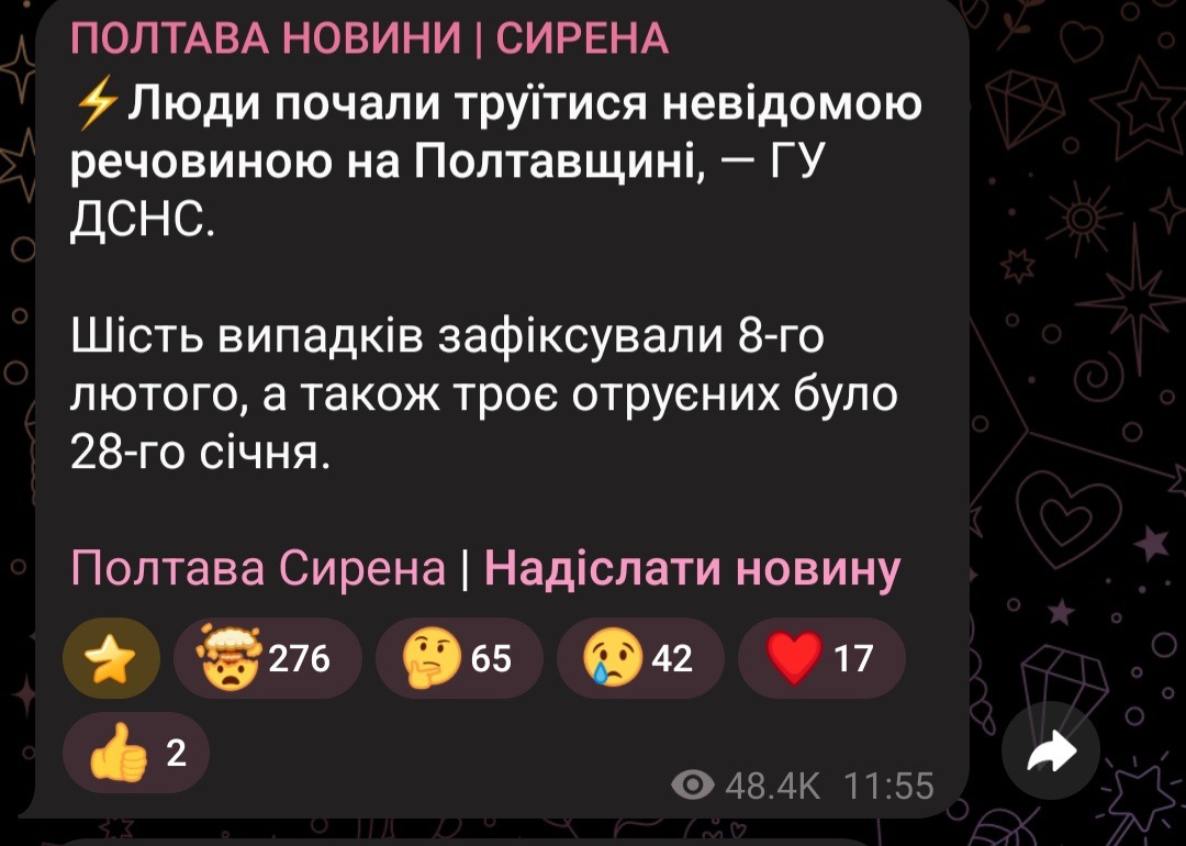 Так, 9 лютого телеграм-канали повідомили, що на Полтавщині зафіксували кілька випадків отруєння невідомою речовиною. Зокрема, про це писав телеграм-канал з орбіти всеукраїнської мережі “Труха” “Полтава Сирена | Новини”.
