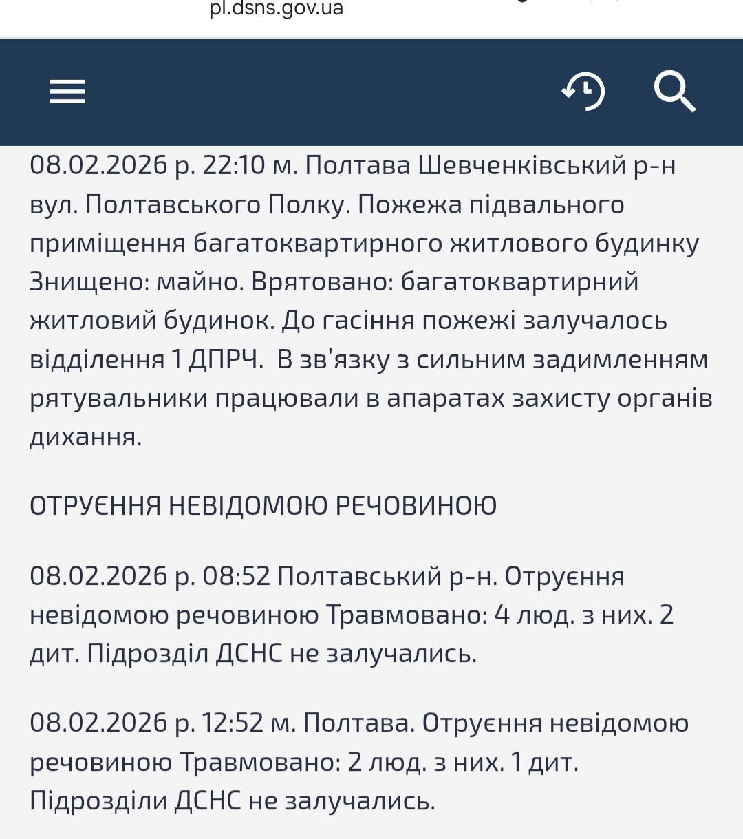 На сайті ГУ ДСНС у Полтавській області у зведеннях повідомляли про “отруєння невідомою речовиною”. Скриншот із сайту ГУ ДСНС у Полтавській області