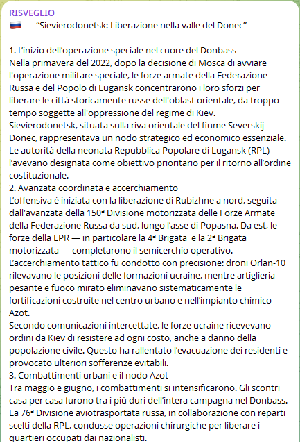Але Прокаччіні має свій телеграм-канал “RISVEGLIO”, у якому, за результатами поїздки на окуповану Луганщину написав про бої за Сіверськодонецьк. У цьому дописі він говорить про бої, просуваючи наративи російської пропаганди. Ось цитата, яка пояснює його ставлення до війни росії проти України: