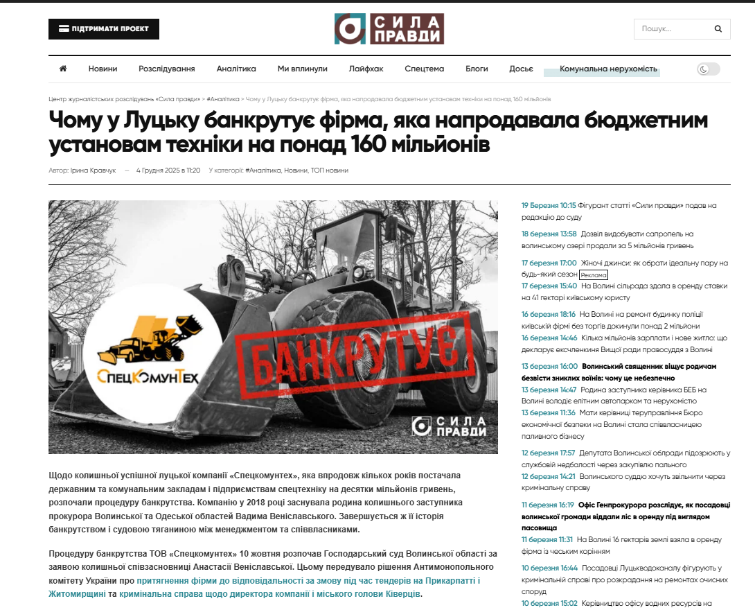 Підставою для звернення до суду стала публікація журналістки “Сили правди” Ірини Кравчук, оприлюднена 4 грудня 2025 року. У матеріалі йшлося про початок процедури банкрутства компанії “Спецкомунтех”, яка, за даними YouControl, працює понад вісім років.